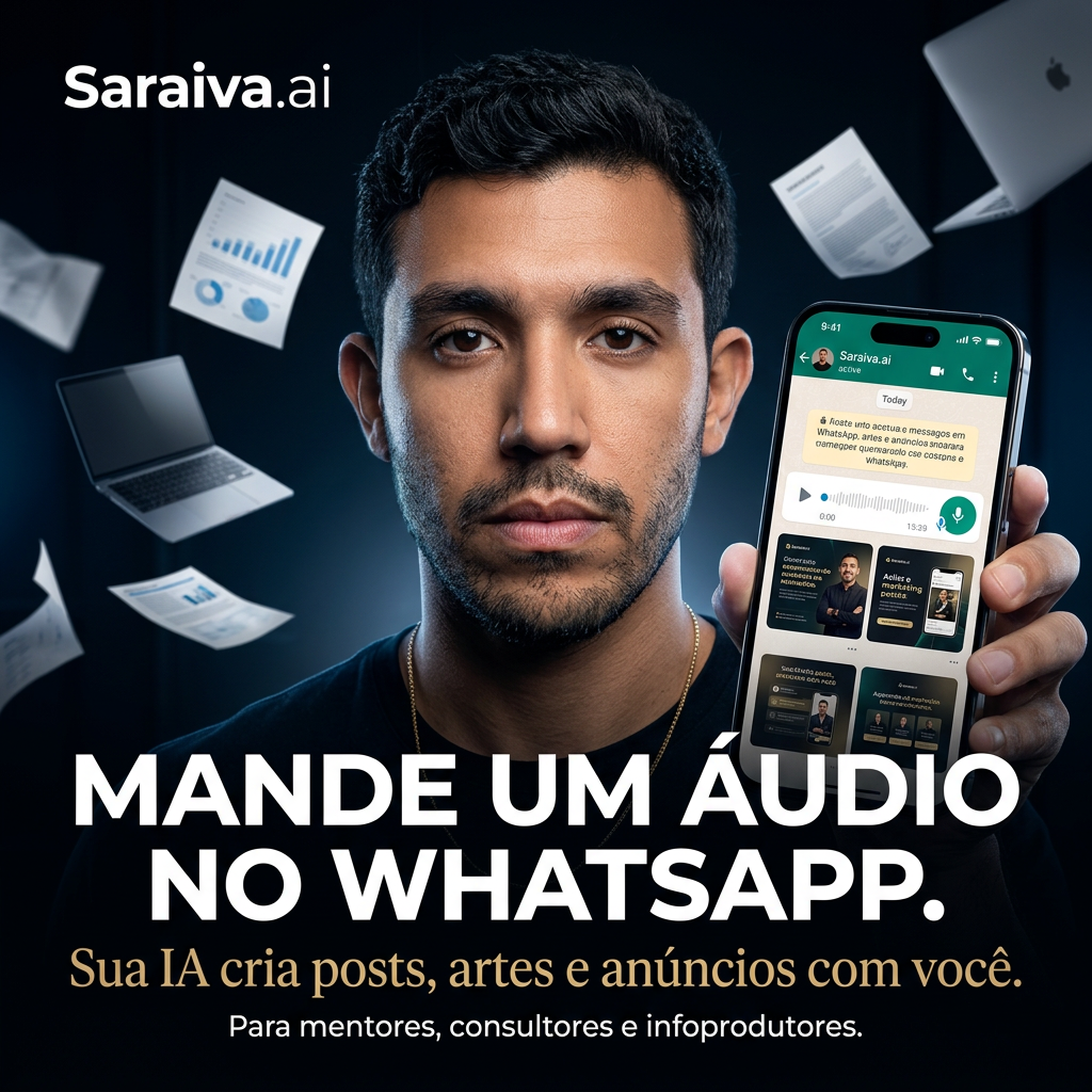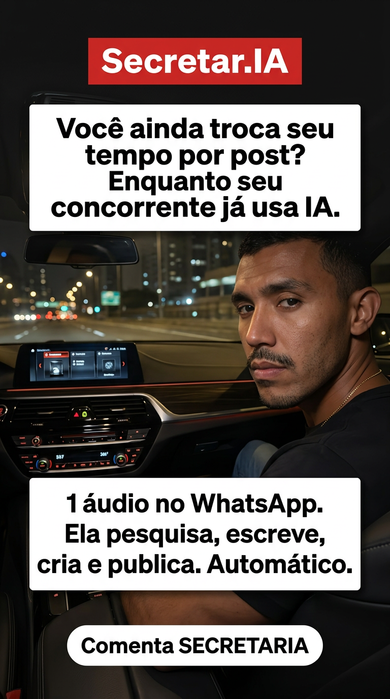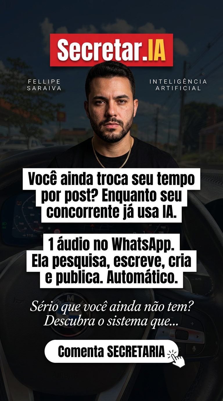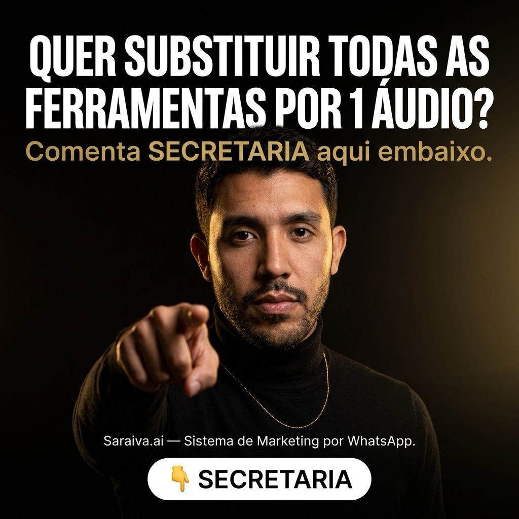 'QUER SUBSTITUIR TODAS AS FERRAMENTAS POR 1 ÁUDIO?' Gold: 'Comenta SECRETARIA aqui embaixo.' Small white: 'Saraiva.ai — Sistema de Marketing por WhatsApp.' Large white pill button at bottom: '👇 SECRETARIA'. Square 1080x1080px.:sec_car_06.jpg